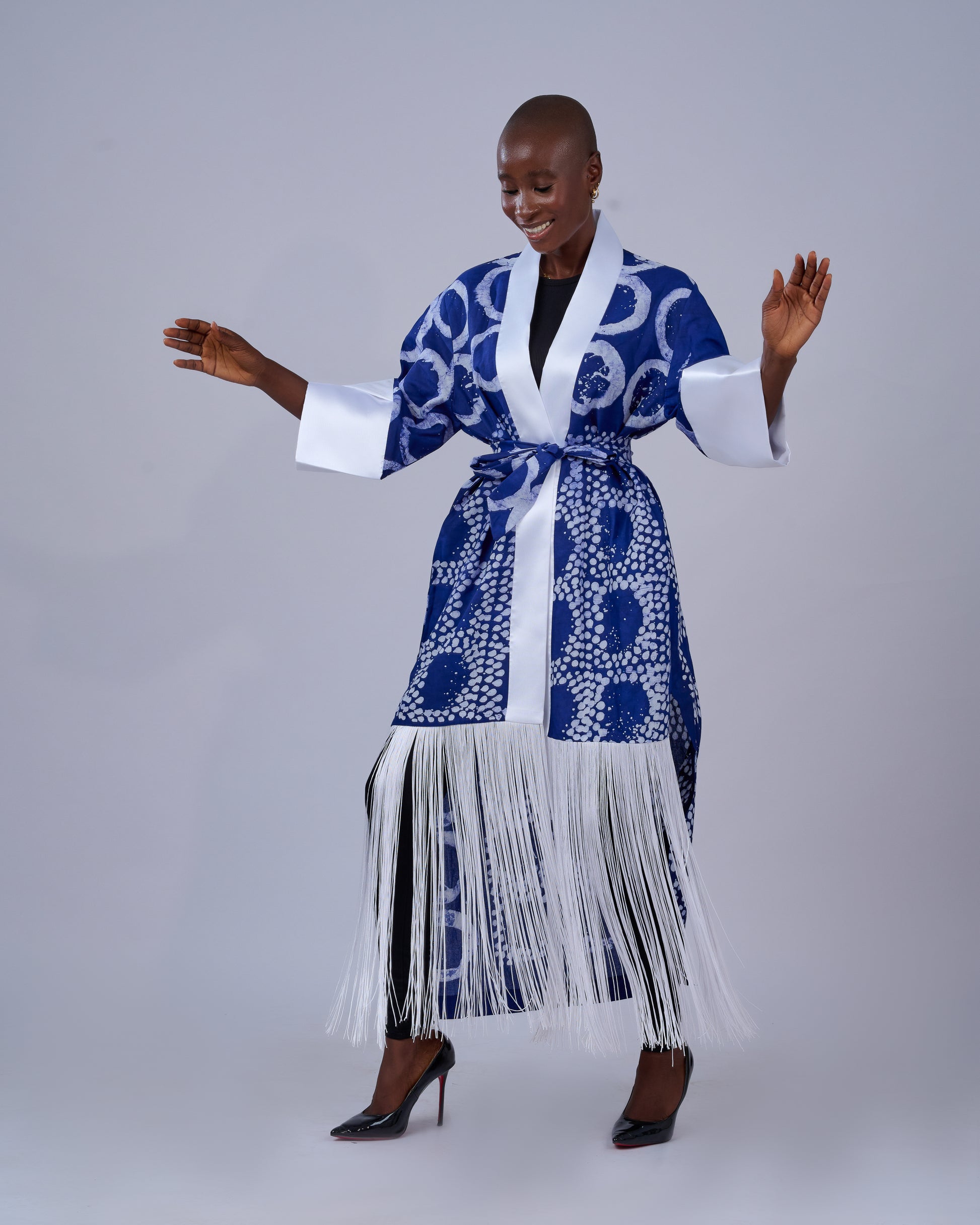 A hand-dyed kimono featuring wide satin trimmed sleeves, a tie waist and playful fringe hem. Perfect for layering and can be cinched at the waist for a flattering silhouette.