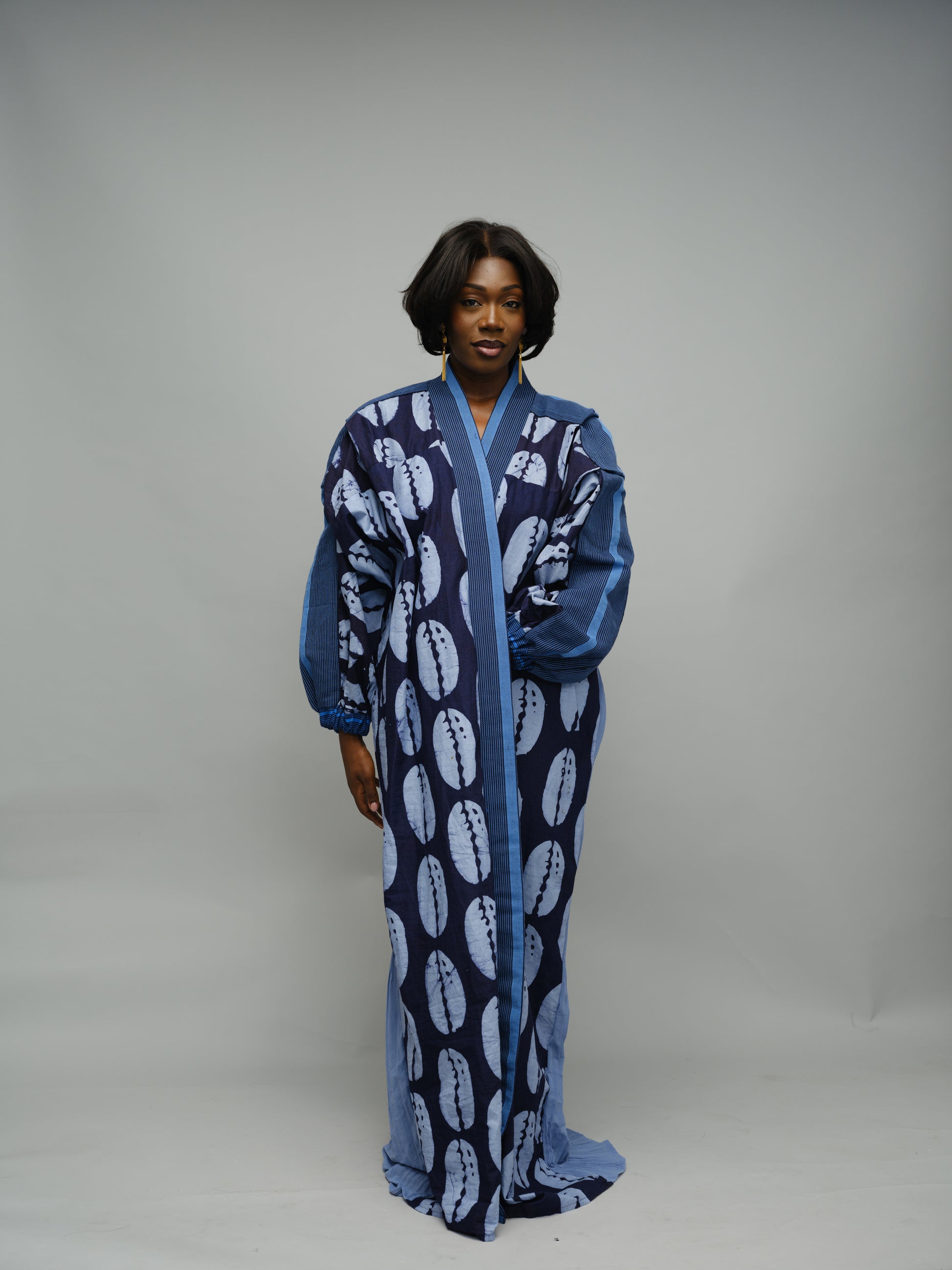 This statement kimono is a fusion of heritage and contemporary style, crafted from hand-dyed Adiire fabric adorned with symbolic cowrie patterns. Framed with rich Asooke borders and finished with matching Asooke sleeves, it embodies artistry and cultural depth in every detail.