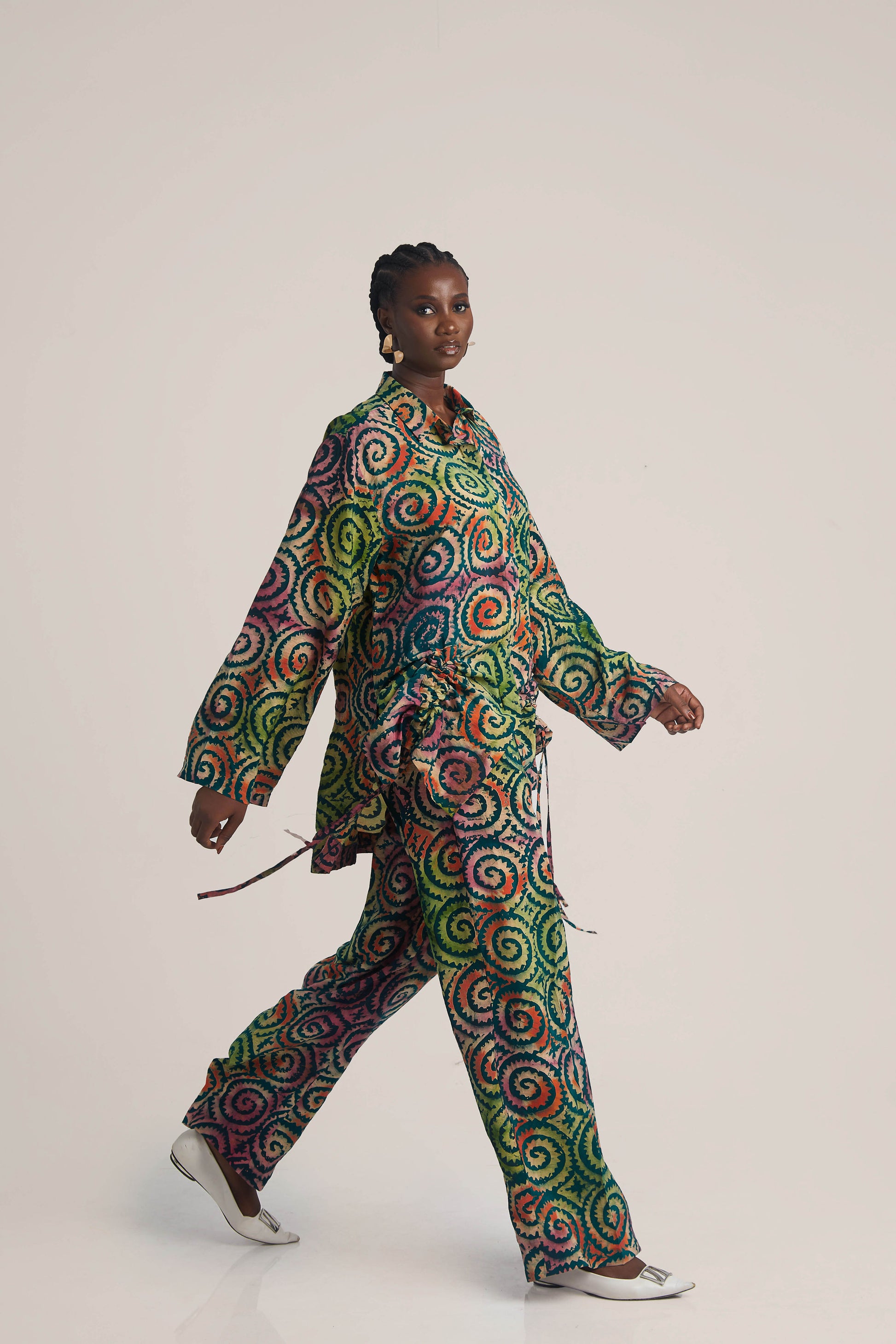 A vibrant co-ord set featuring a relaxed button-down and straight-leg trousers. Designed in a bold spiral print with side-tie details, it’s an effortless style with a statement edge.