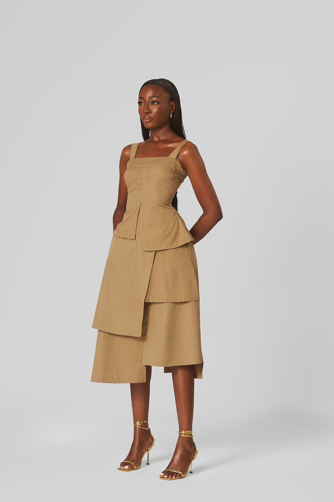 This set pairs a fitted sleeveless top with an asymmetrical hemline for a touch of edge. It’s complemented by a multi-layer midi skirt that adds volume, movement, and refined elegance. Together, the ensemble balances structure and flow, making it a standout choice for both elevated daywear and chic evening occasions.