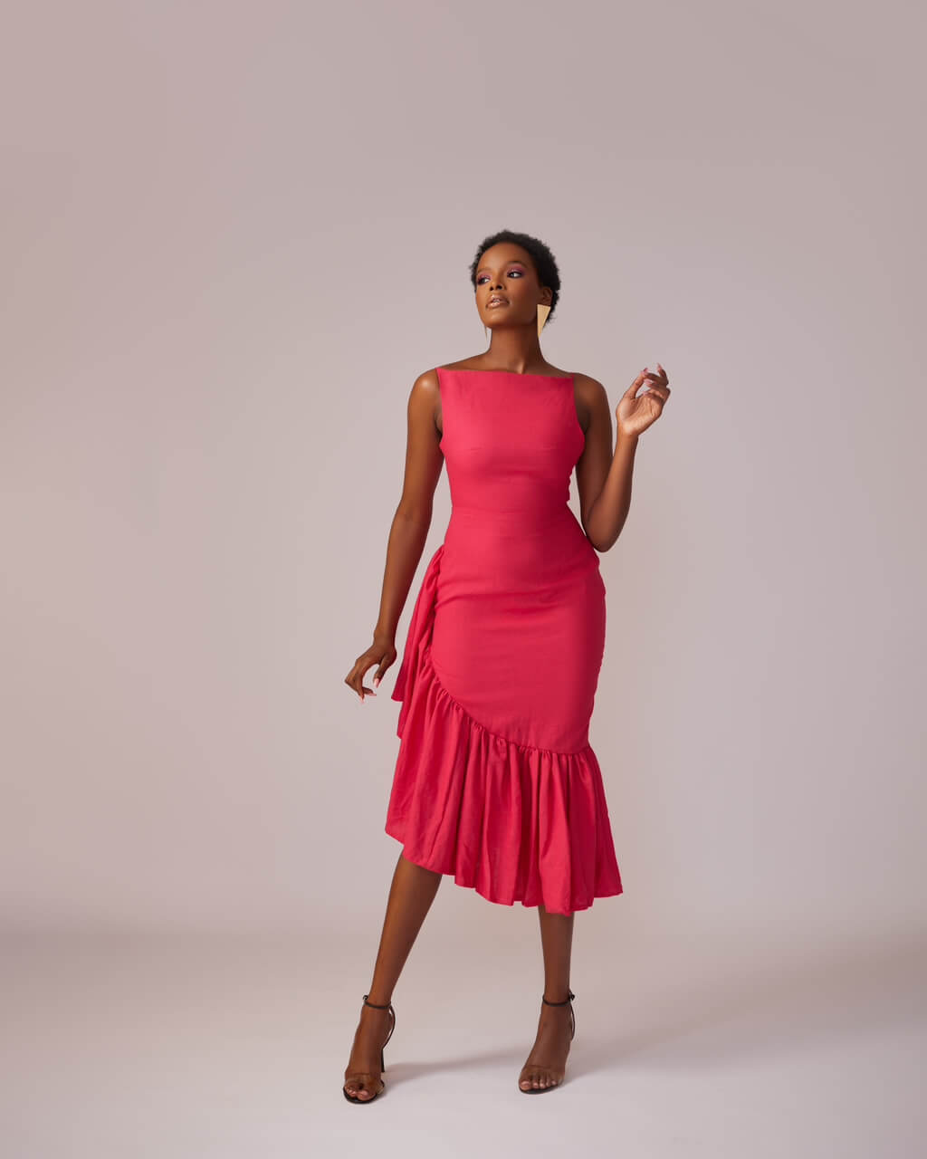 Make a memorable entrance in this dress. This midi dress combines a classic silhouette with playful, modern details. The sleek, sleeveless bodice offers a clean and elegant profile, while a cascade of asymmetrical ruffles adds dynamic movement and visual interest to it. It's the perfect statement piece for a wedding, cocktail party, or any event where you want to stand out