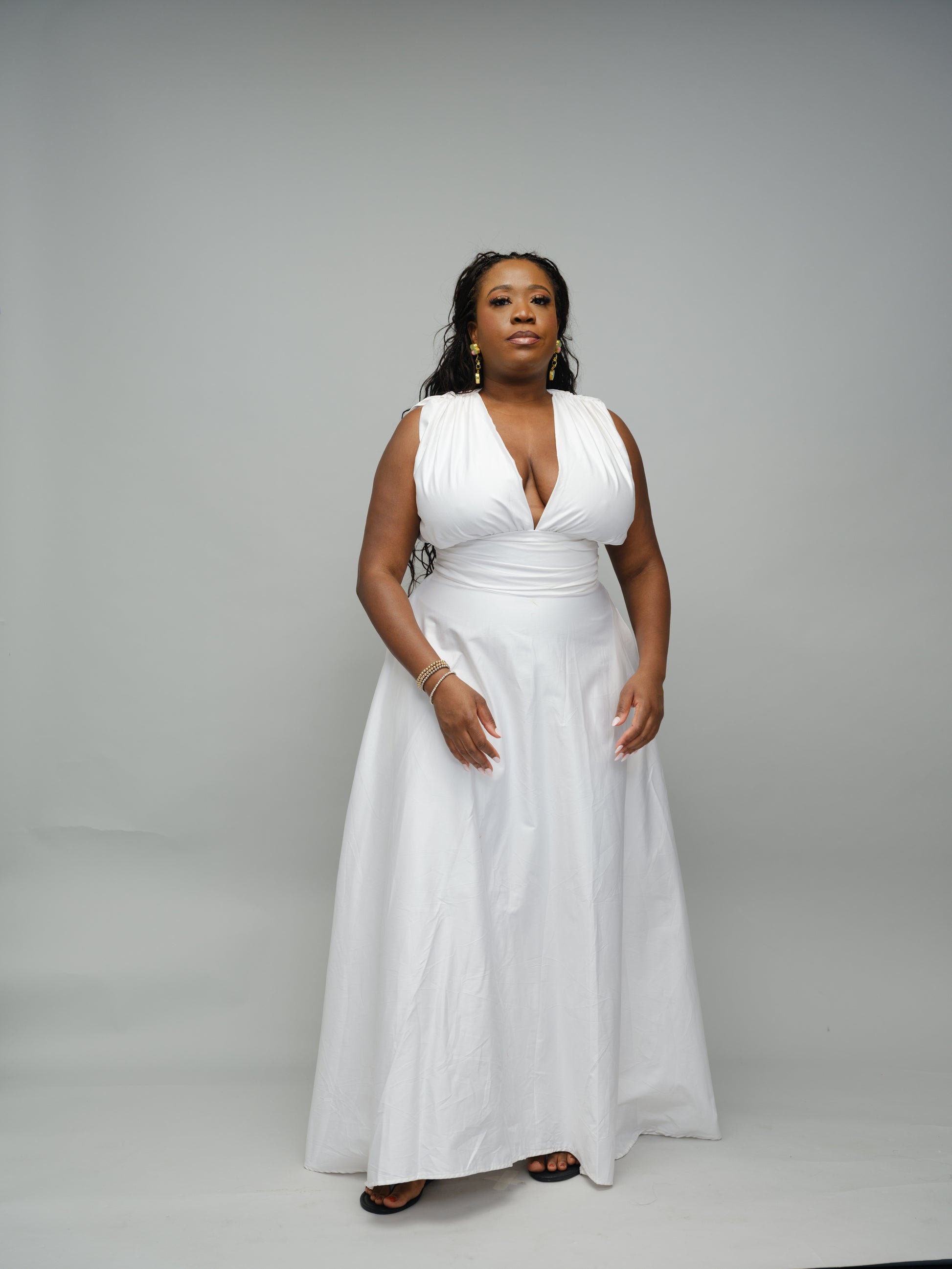 Crafted from lightweight, breathable fabric, this gown blends comfort with style, making it perfect for weddings, galas, or any upscale event. The sleeveless cut adds a modern touch, while the minimalist design allows for bold accessorizing.