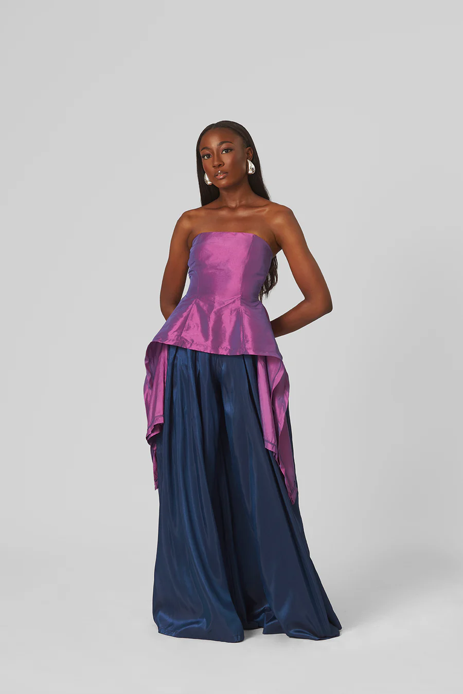 Sleek and contemporary, this strapless top is defined by its clean neckline and striking asymmetric hem.