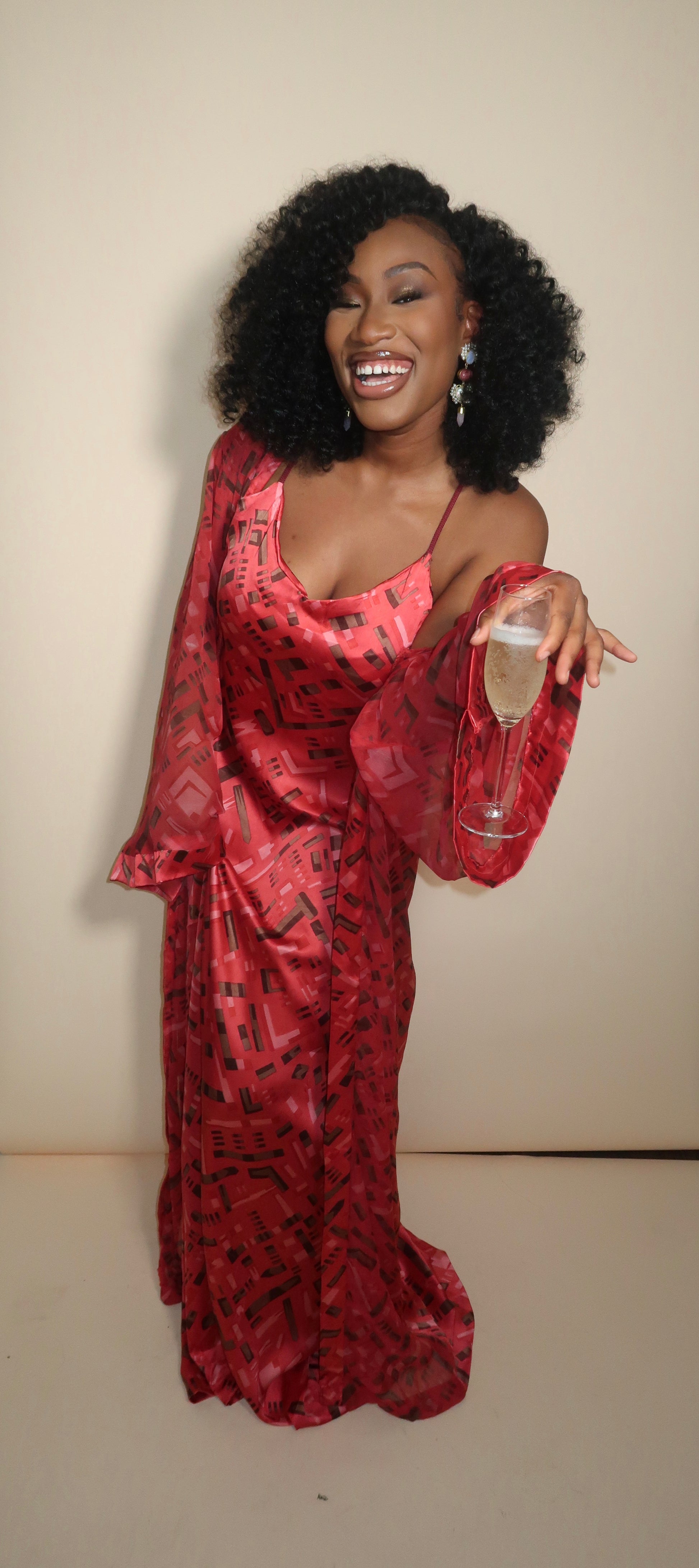 This dress is distinguished by its intricate patterned finish and adjustable straps, offering both style and a personalised fit. With its airy drape and delicate feel, it transitions seamlessly from refined daytime wear to graceful evening looks.