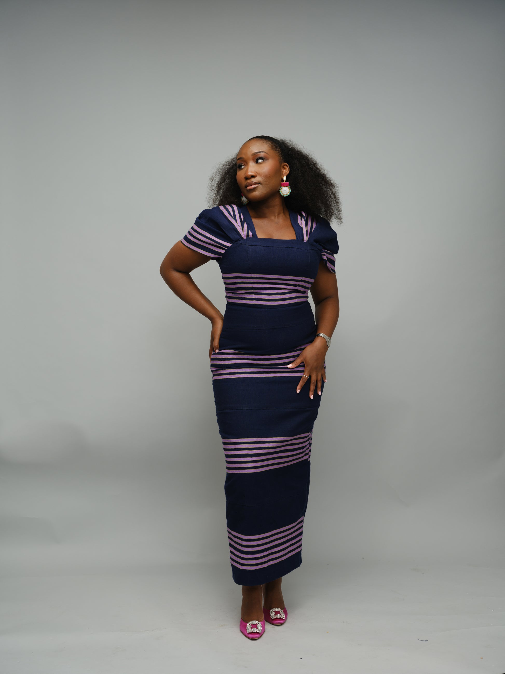Crafted from handwoven Aso-oke, this puff sleeve dress is a bold celebration of African heritage with a modern twist. The striking purple and navy blue stripes create a timeless yet contemporary silhouette, while the voluminous puff sleeves add effortless drama and elegance.